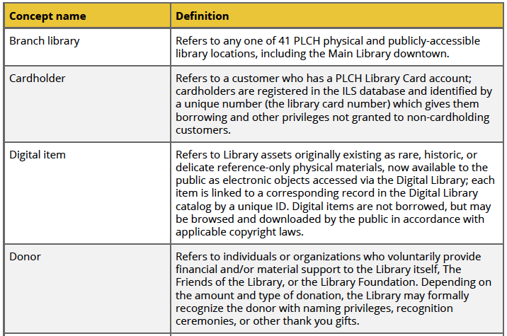 The PLCH Business Glossary will support consistent use of business language, clarify semantic associations between key concepts, and define all the metadata needed by various agencies to find organizational information. This is particularly important for expediency in customer service. Developing an authoritative source of truth for Library Services definitions and associations will ensure that everyone is on the same page when delivering services, conducting programs, and communicating with each other and our customers.