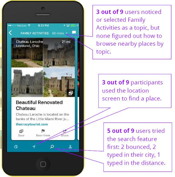 Three out of 9 users experienced difficulty finding places, and 4 users remarked that they wanted to see more practical information in the place cards.