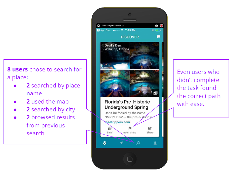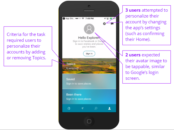 Three users succeeded with difficulty, either due to sign in obstacles or confusion about the app’s navigation icons. Five users remarked positively about content such as photos, reviews, maps, and seeing more unique NY attractions.