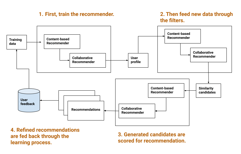 - The resultant candidates are then scored by the system to produce its final recommendations, which may then be refined via user-contributed ratings before the learning process starts anew.